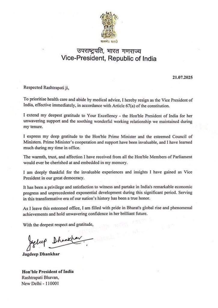 भारत के उपराष्ट्रपति जगदीप धनखड़ ने अपने पद से इस्तीफा दे दिया है। उन्होंने अपना इस्तीफा राष्ट्रपति को सौंप दिया है।
