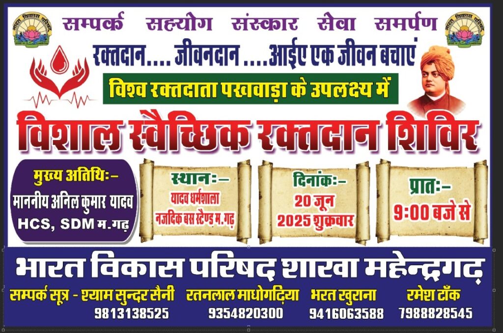 महेंद्रगढ़,17जून(शैलेन्द्र सिंह)।विश्व रक्तदान पखवाड़ा के अंतर्गत भारत विकास परिषद शाखा, महेंद्रगढ़ द्वारा दिनांक 20 जून 2025 वार शुक्रवार को अमर