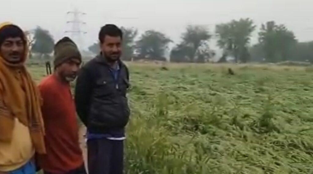 तेज बारिश के कारण जमीन पर गेहूं की फसल पसरी देख किसान के निकले आंसू